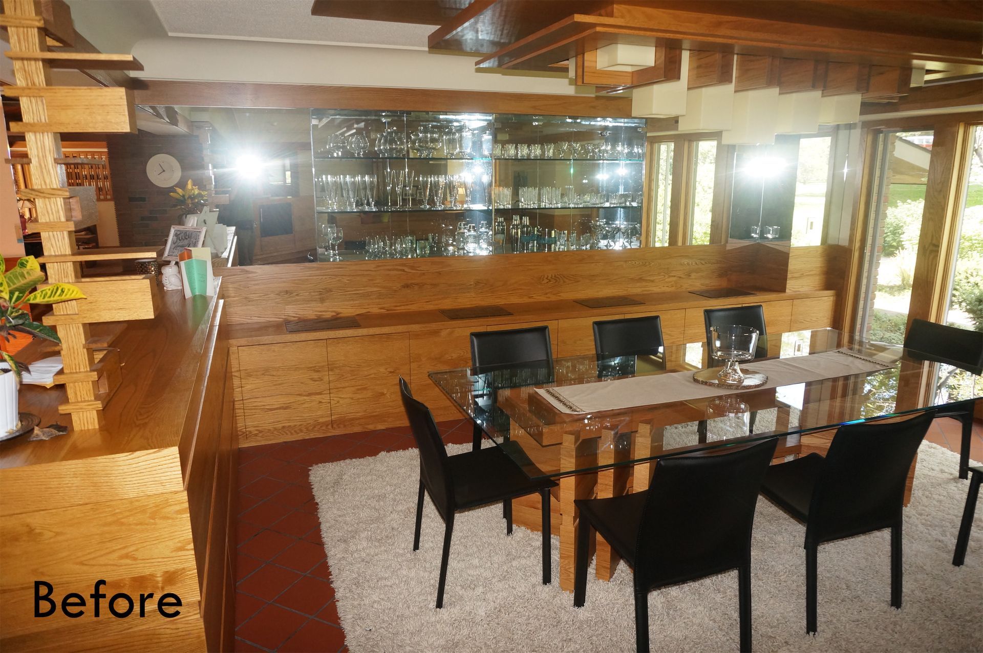 Other improvements to the home included removing mirrors from walls, replacing a large site-built light fixture over the dining table with LED light boxes with Frank Lloyd Wright window patterns over them, installing new LED light fixtures throughout, as well as energy improvements including replacing the furnace and AC unit, insulating the attic, and dampproofing the crawl space.