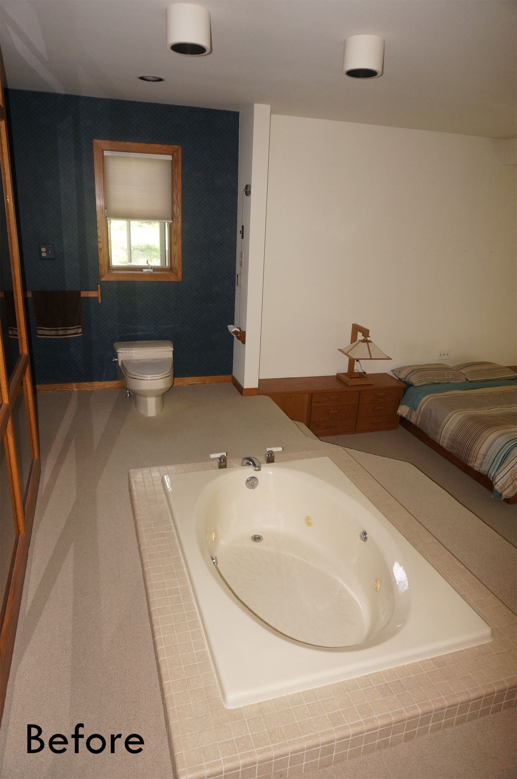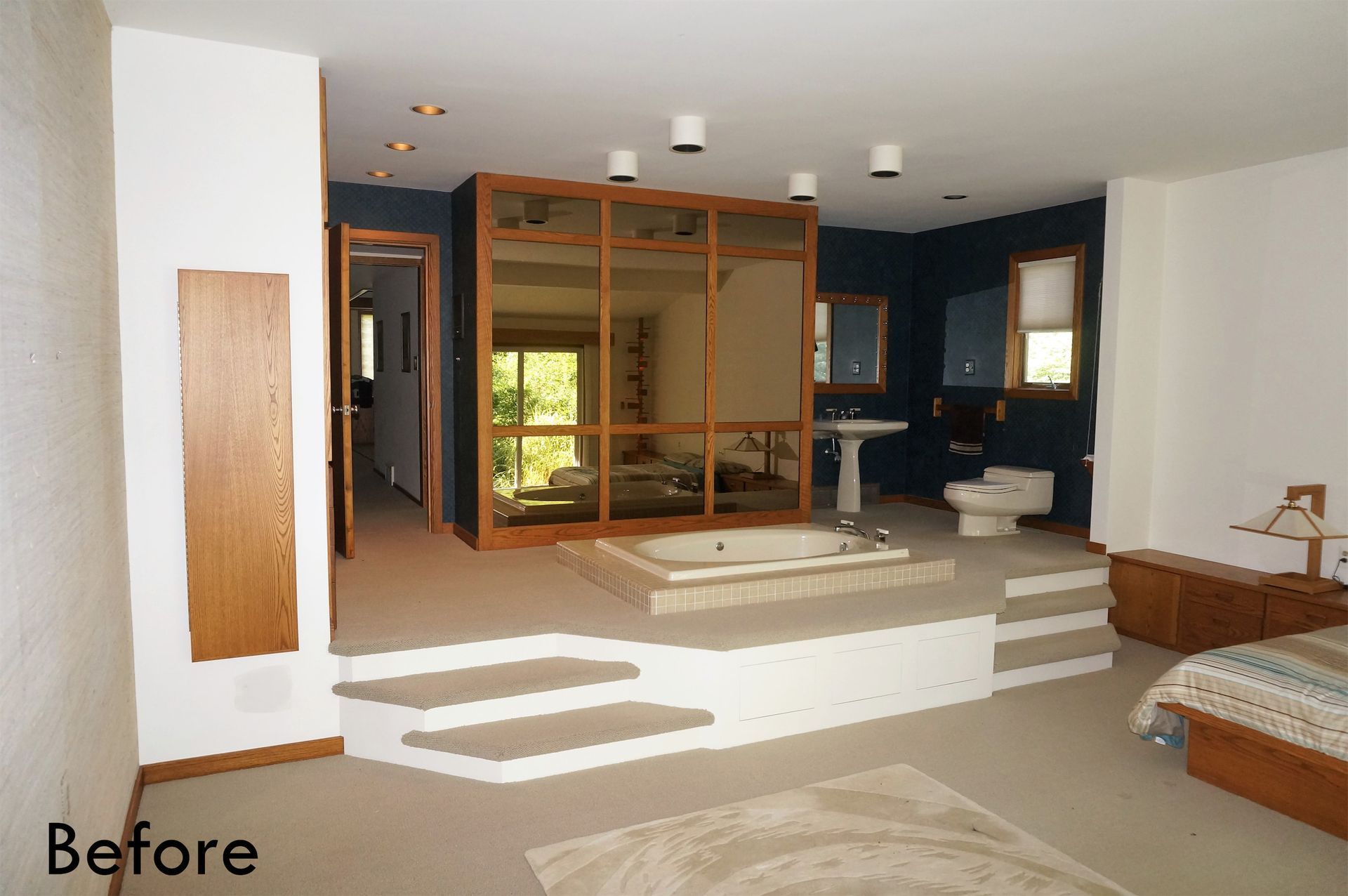 The public parts of the home were filled with meticulously-detailed custom oak built-ins, but the primary suite was right out of the 1970s. The bathroom was completely open to the bedroom; in fact, a person had to walk through the bathroom and go down three steps to reach the bedroom. The bathroom contained a sunken tub, pedestal sink, and toilet and was directly across the bedroom from a wall of patio doors.