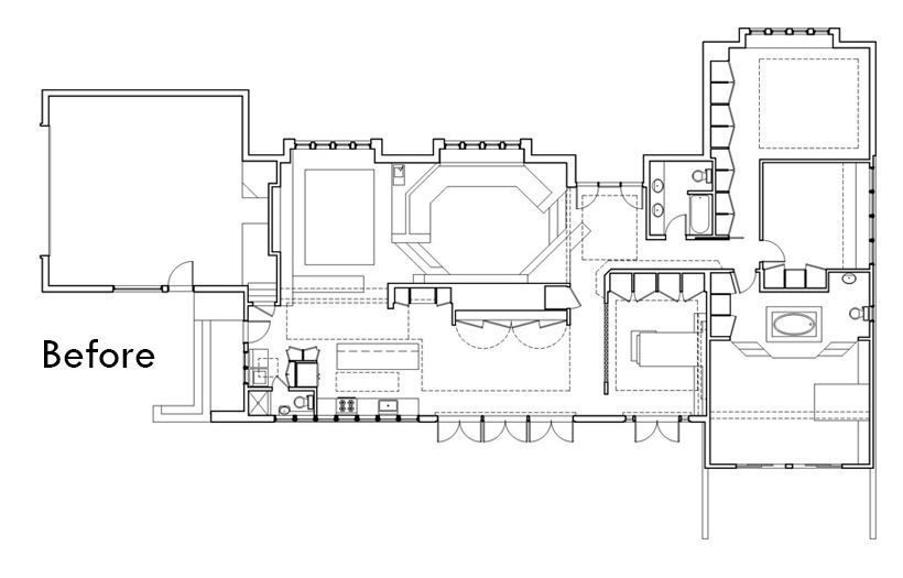 - Before: beautiful Frank Lloyd Wright-inspired home with outdated 1970s primary bedroom & bath