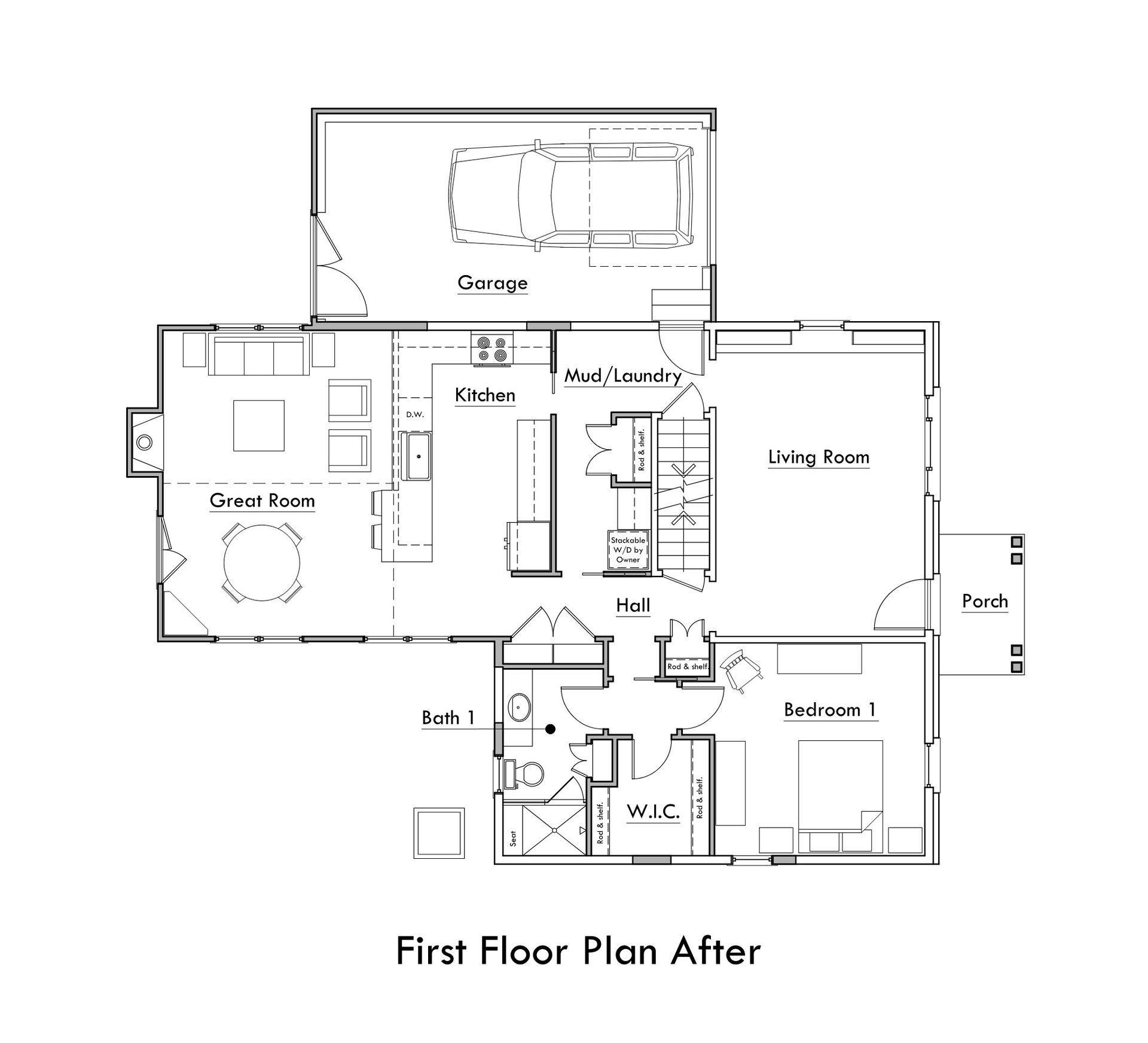 - Interior space was reconfigured to a “Ms. suite”—a first floor bedroom with an en-suite bathroom.