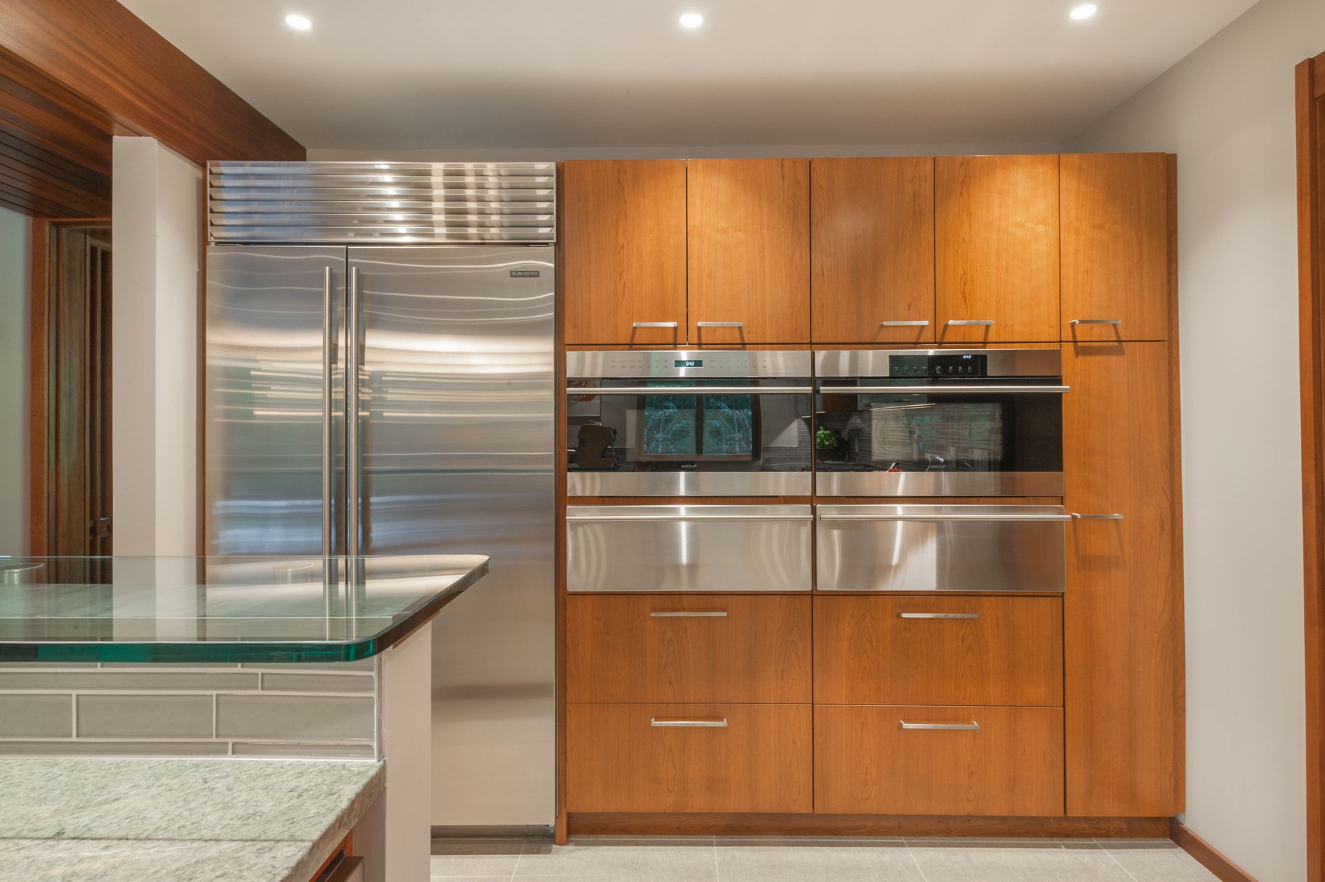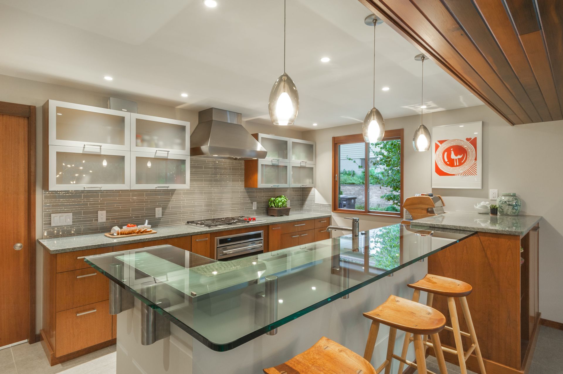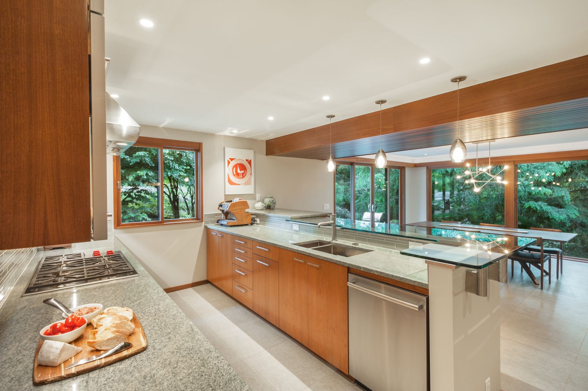 The homeowners were two years into a three-year period of living in China when they purchased a mid-century modern gem of a home designed by the well-known local modernist architect Robert Metcalf. Metcalf was known for meticulously-detailed wood and glass homes with (unfortunately) small kitchens. The wife loves to cook and entertain, and has worked as a chef in several Ann Arbor​ restaurants, so the 1960s galley kitchen was not sufficient for her needs.