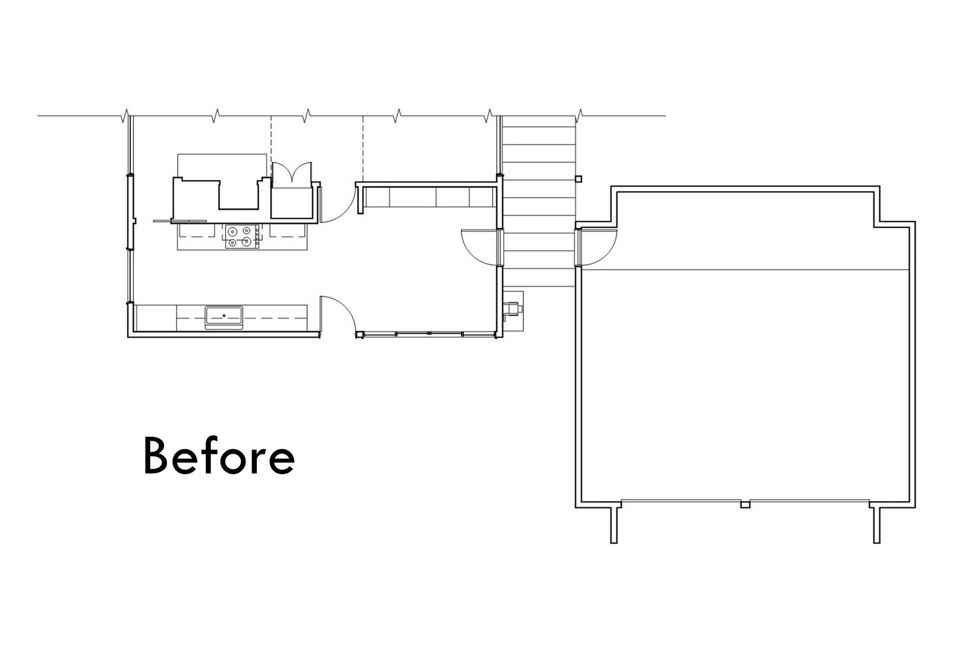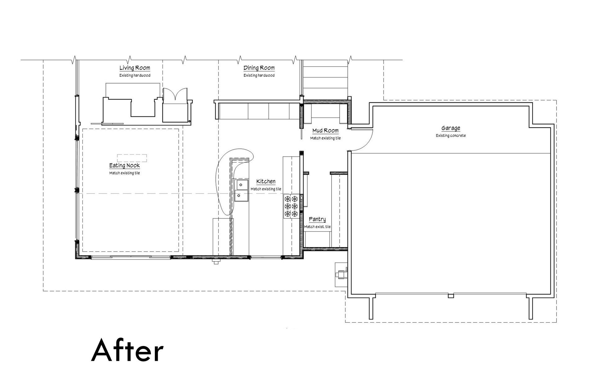 When they first approached Studio Z, the homeowners planned to add 8’ to the south end of the house to essentially double the size of the kitchen and eating nook. This design would have kept the kitchen in the southeast corner of the house, with the best views of the backyard, while leaving the eating nook between the kitchen and the garage.