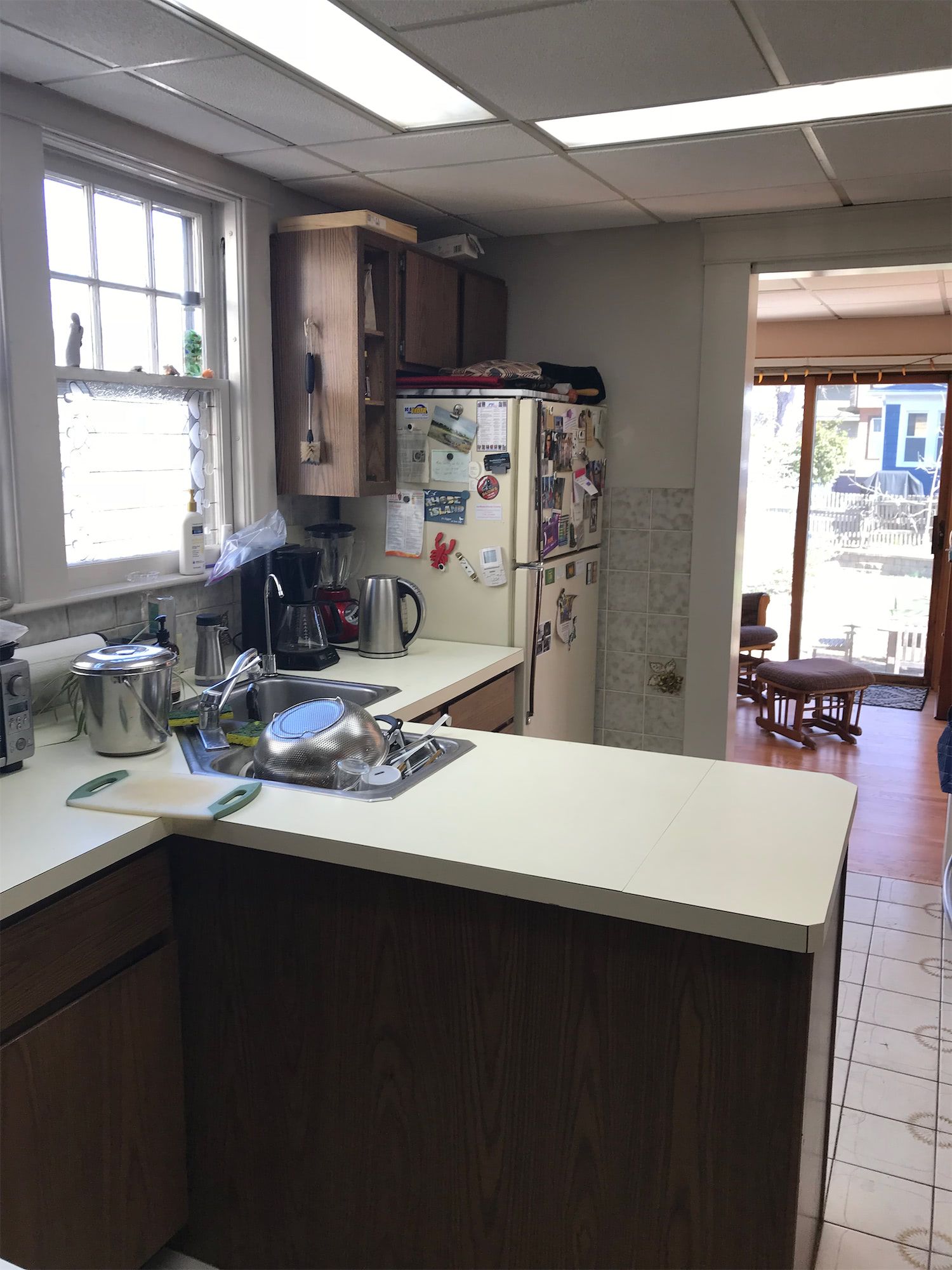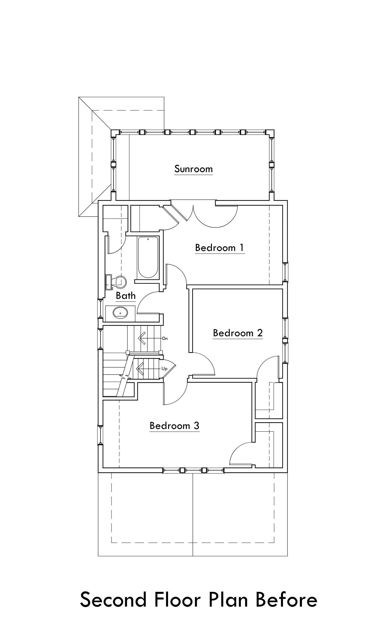 Originally, the homeowners were planning to leave the first floor plan essentially intact but improve the functionality by gutting the kitchen, adding a full bathroom, and reconfiguring some door openings. Similarly, upstairs, the homeowners were thinking about expanding the back bedroom into the sunroom to form a larger primary suite. Unfortunately, this would have been awkward (and potentially dangerous!) because the sunroom floor was a step below the rest of the second floor.