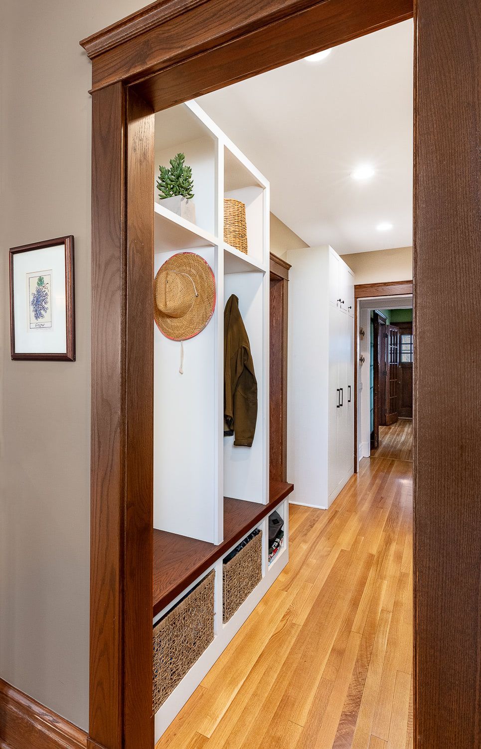 The homeowners loved the home’s location and the original windows and French doors in the home, but they wanted to renovate and update the 1980s F-shaped kitchen, add a bathroom or two, and enlarge the primary suite. They also wanted to add some built-in bookcases to the living room.