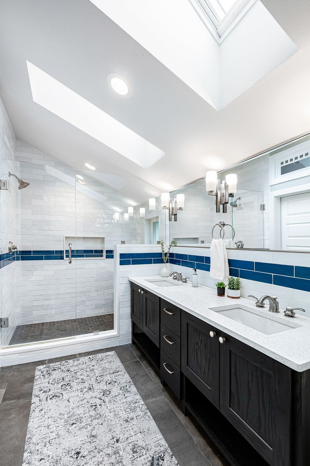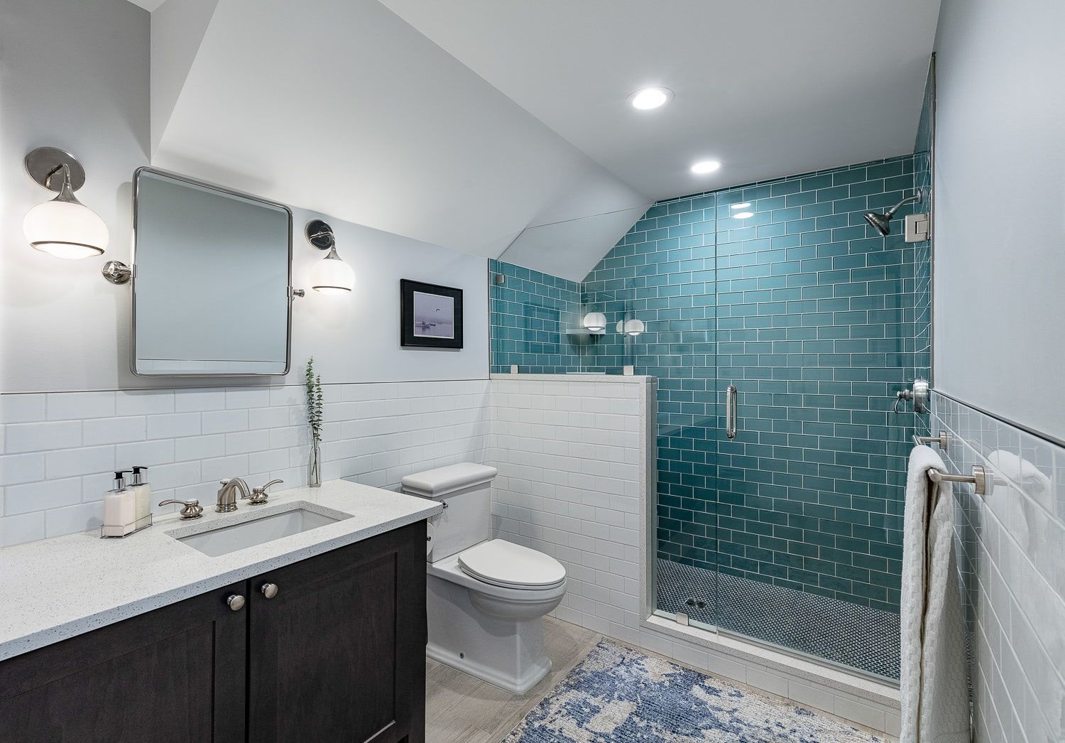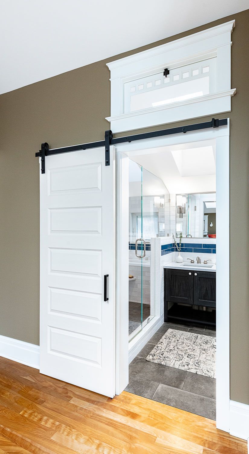 Studio Z designed a primary suite upstairs, with a walk-in closet and ensuite bathroom. The original cramped hall bathroom was renovated to be more open and spacious, with a new glass tile shower and longer vanity.
