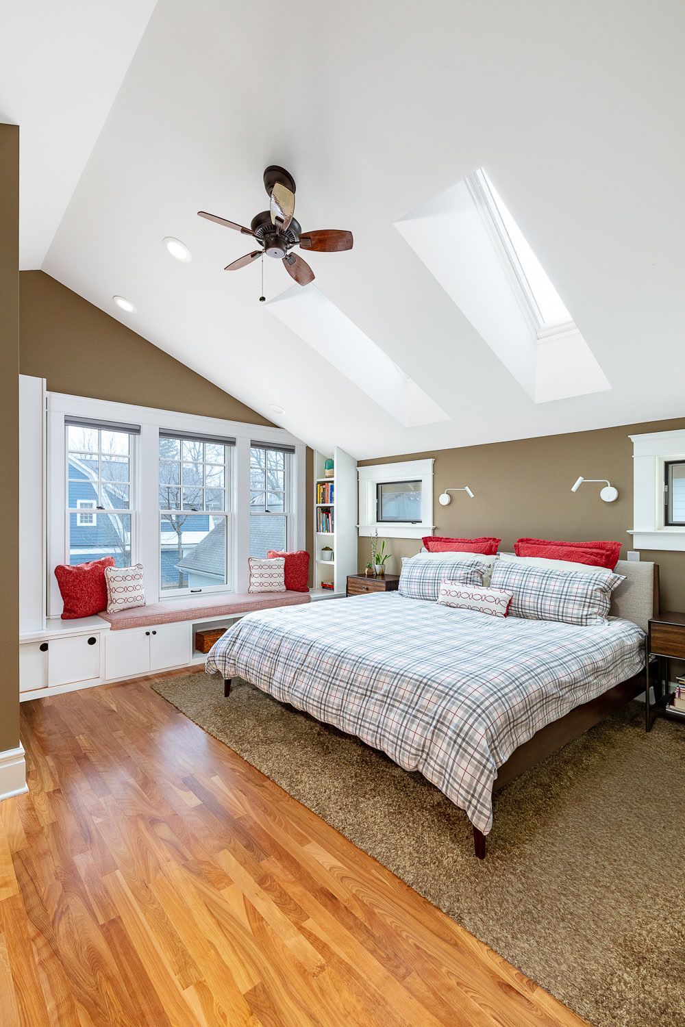 Over the primary suite, Studio Z designed a scissors truss roof that aligns seamlessly with the existing roof from the outside but provides vaulted ceilings over the primary suite for an airy, spacious feeling. Four skylights were added for additional light and ventilation.