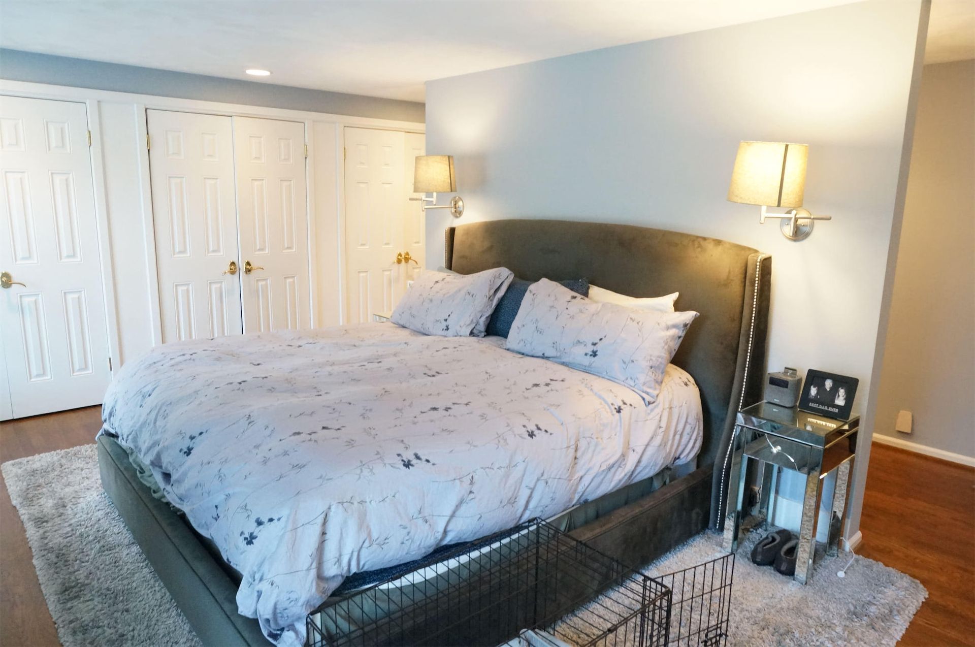 A new primary suite boasts a fresh design with a large bedroom, spacious walk-in closet, spa-like bathroom, and a home gym.