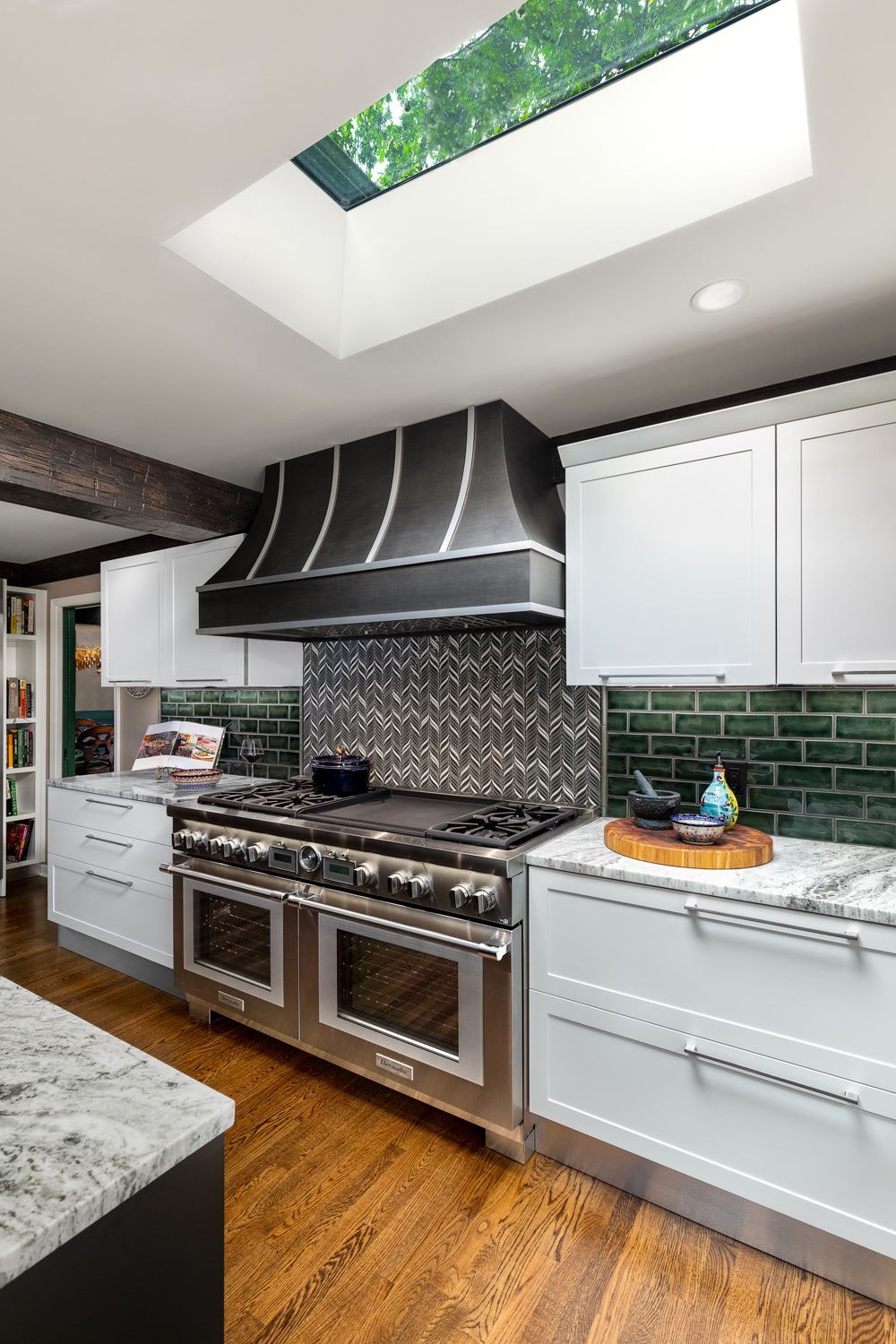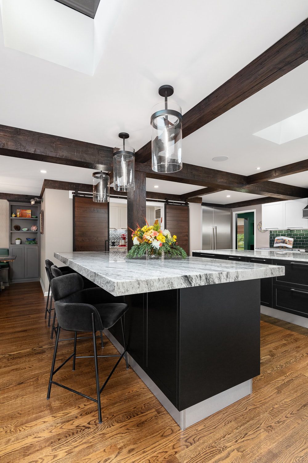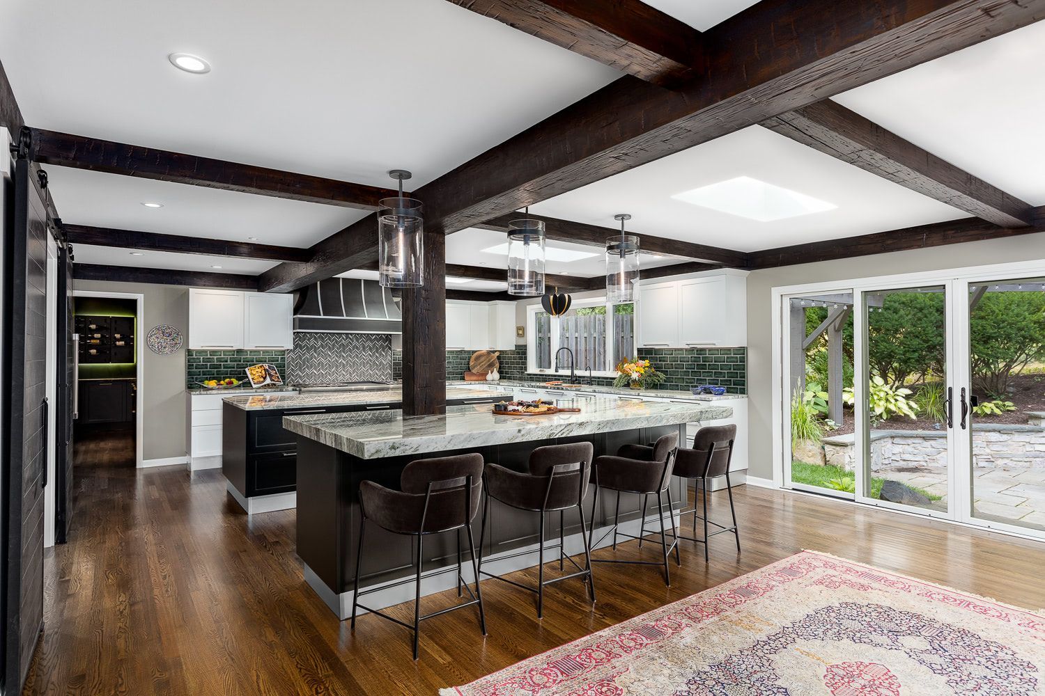 Redesigning and expanding the first floor added a large, open kitchen with skylights over the dual islands. A walk-in pantry provides much-needed space for storage and cooking.
