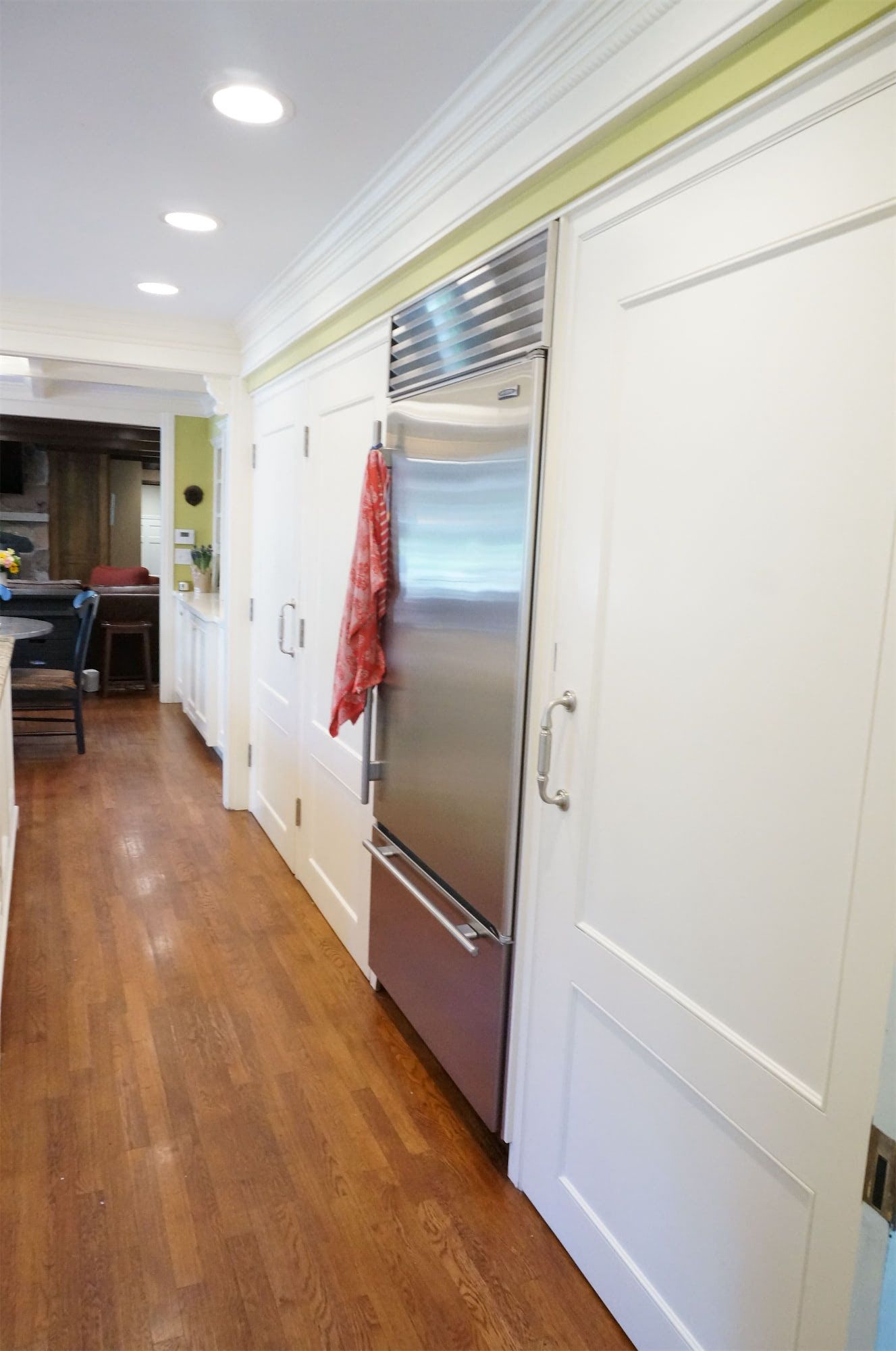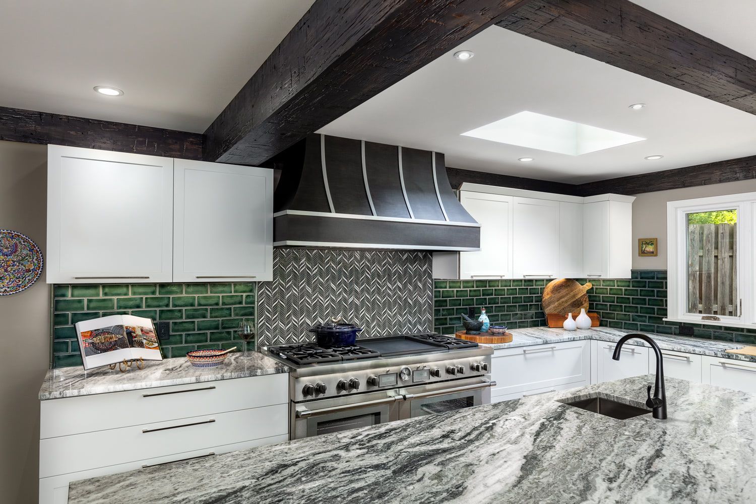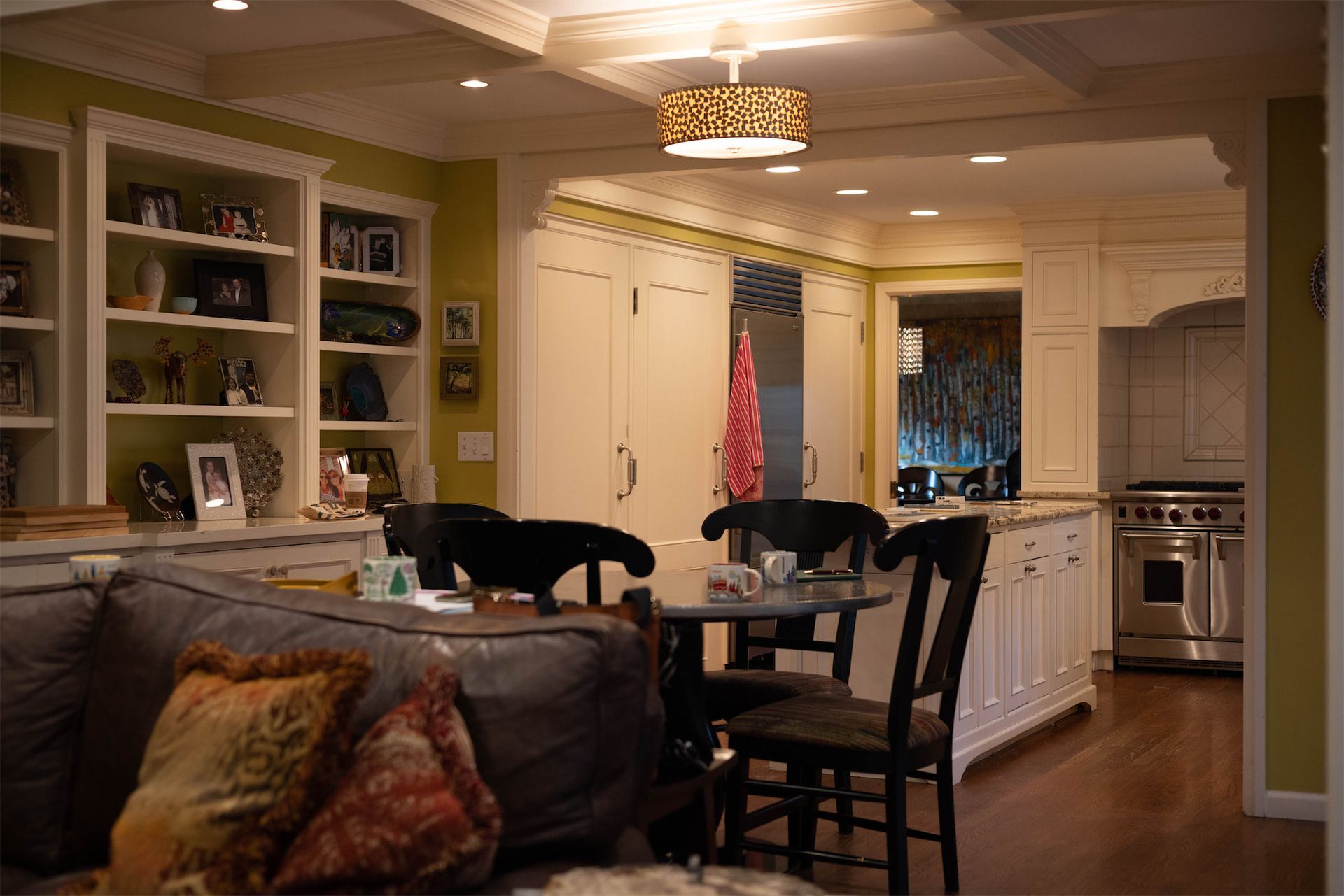 Redesigning and expanding the first floor added a large, open kitchen with skylights over the dual islands. A walk-in pantry provides much-needed space for storage and cooking.