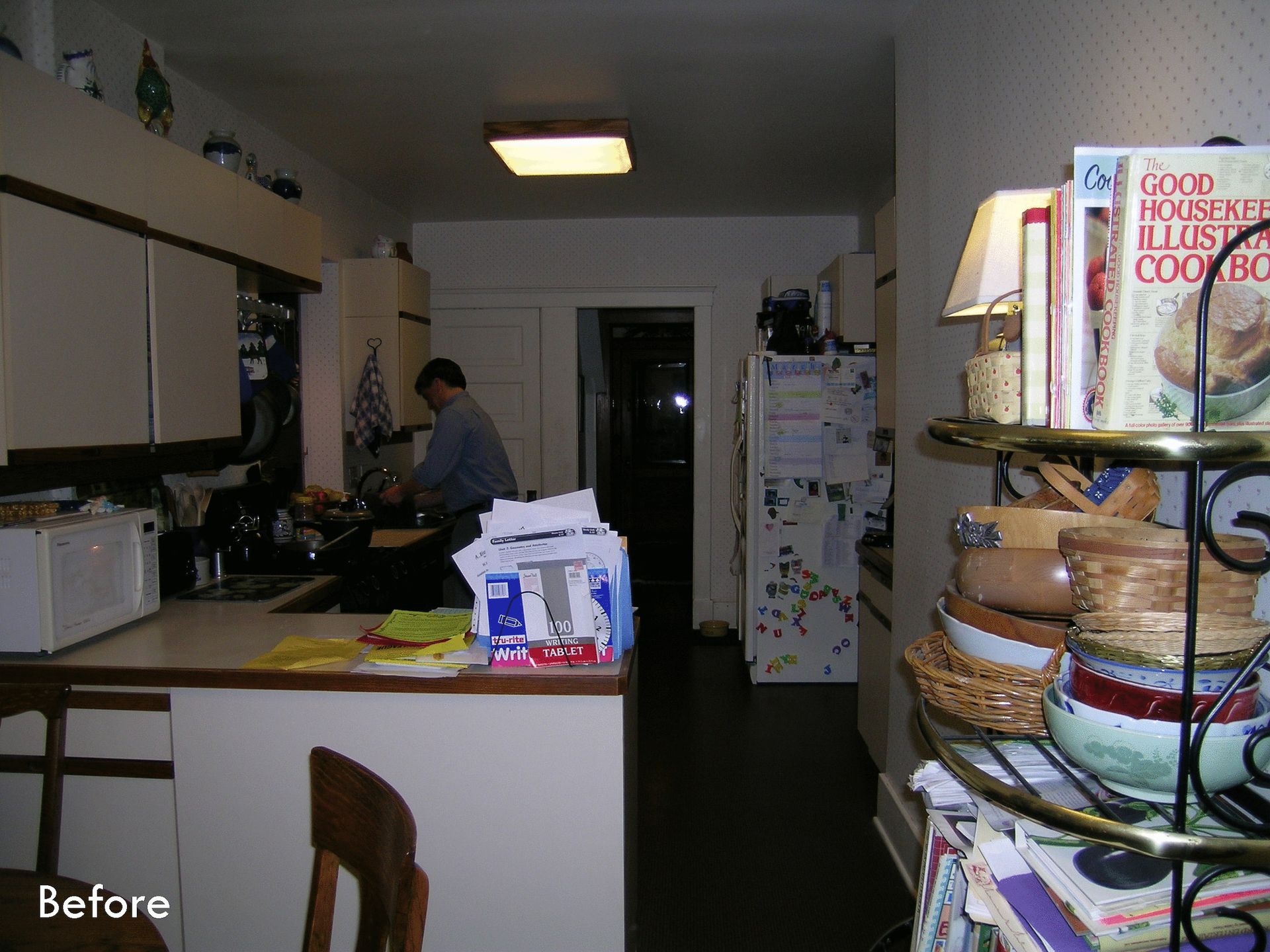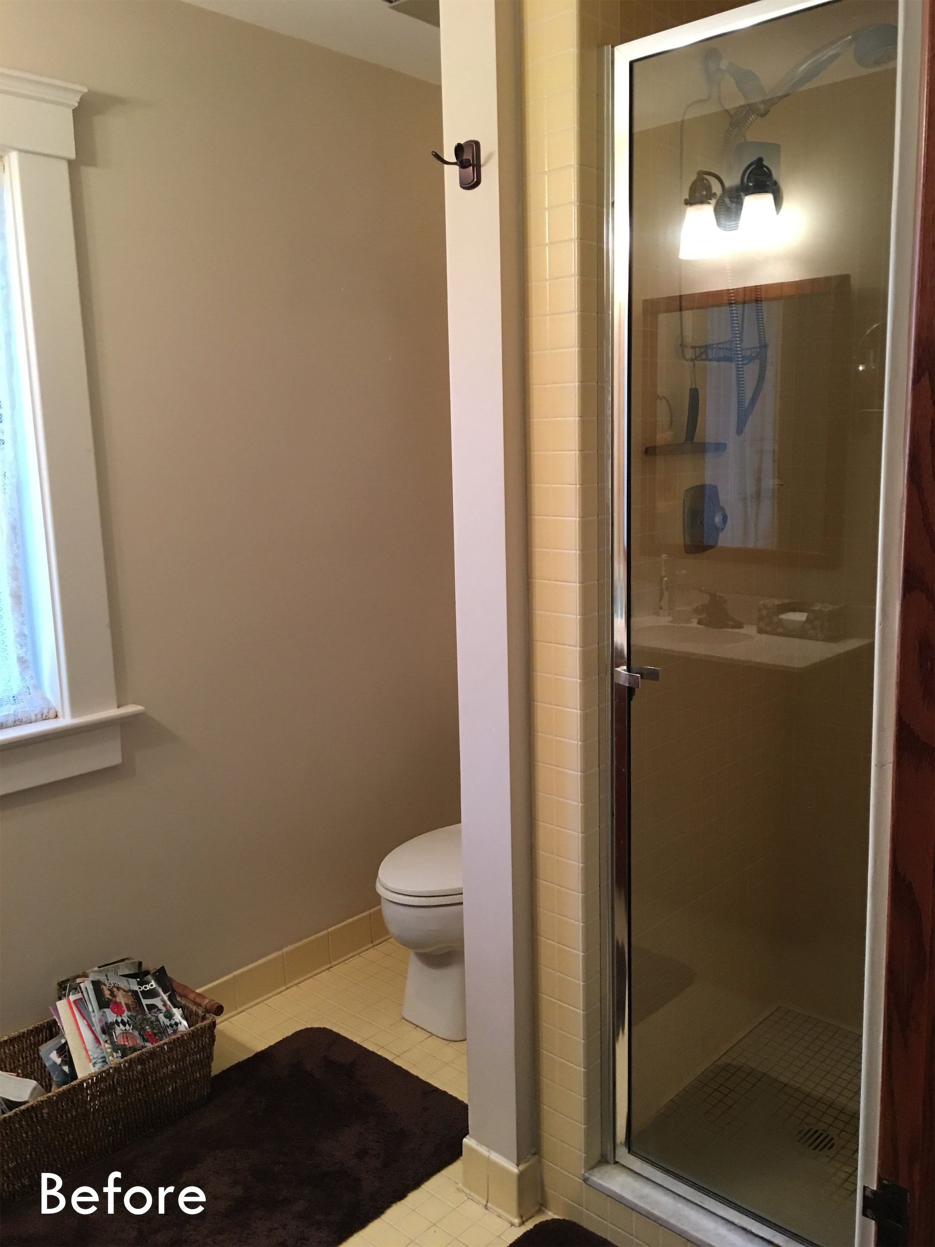 The existing bathroom at the back of the kitchen was added in the 1980s and hadn’t been updated since. The homeowners decided to gut it and to install new fixtures, including a new glassed-in shower with glass block windows on the north wall. Crisp white wainscot with Motawi gingko tiles lines the room. We recommended replacing the existing casement window, which opened over the stairway from the deck behind the house, to a wider double-hung window, making the deck stairway safer and bringing more natural light into the bathroom.