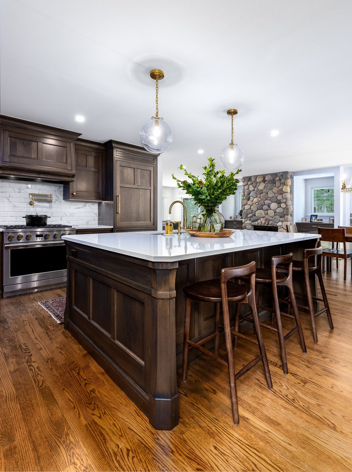 The existing L-shaped kitchen had an island with a sideways sink in it, presumably so it could be used from either side of the island, and there was an odd closet that had glass doors and functioned more as a china cabinet than a pantry. A landlocked formal dining room was rarely used, although the dining table provided a perfect surface for folding laundry.