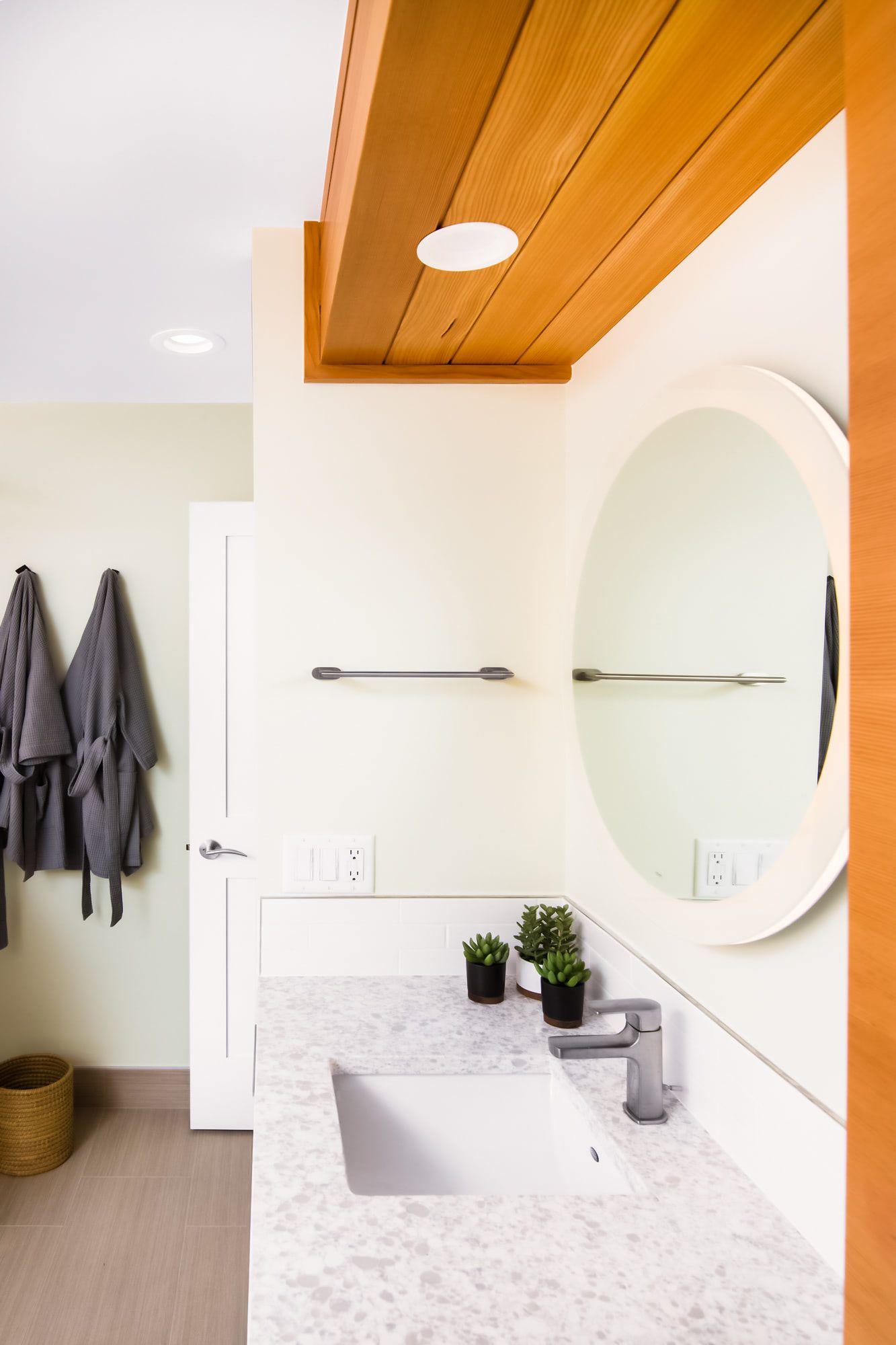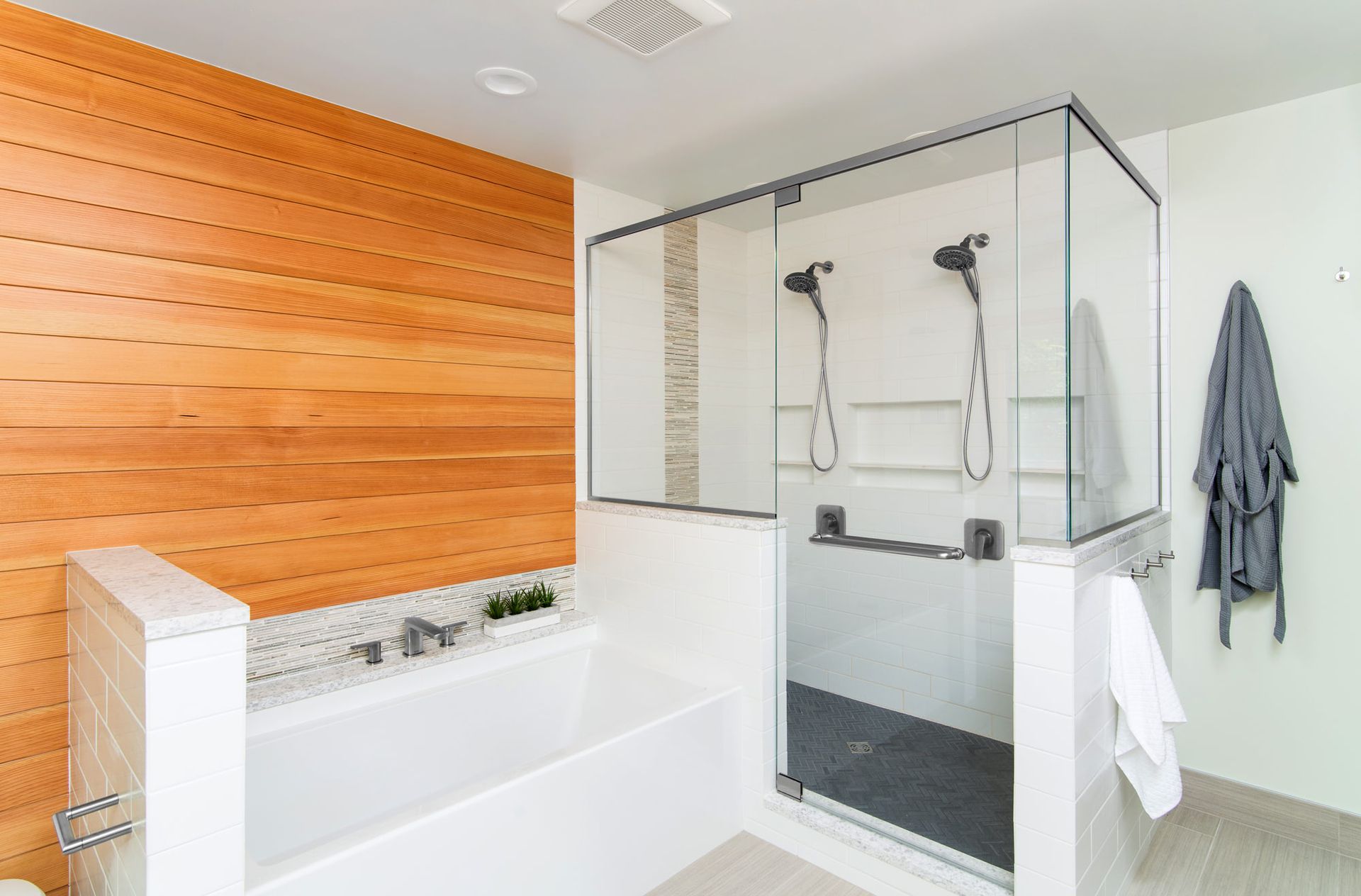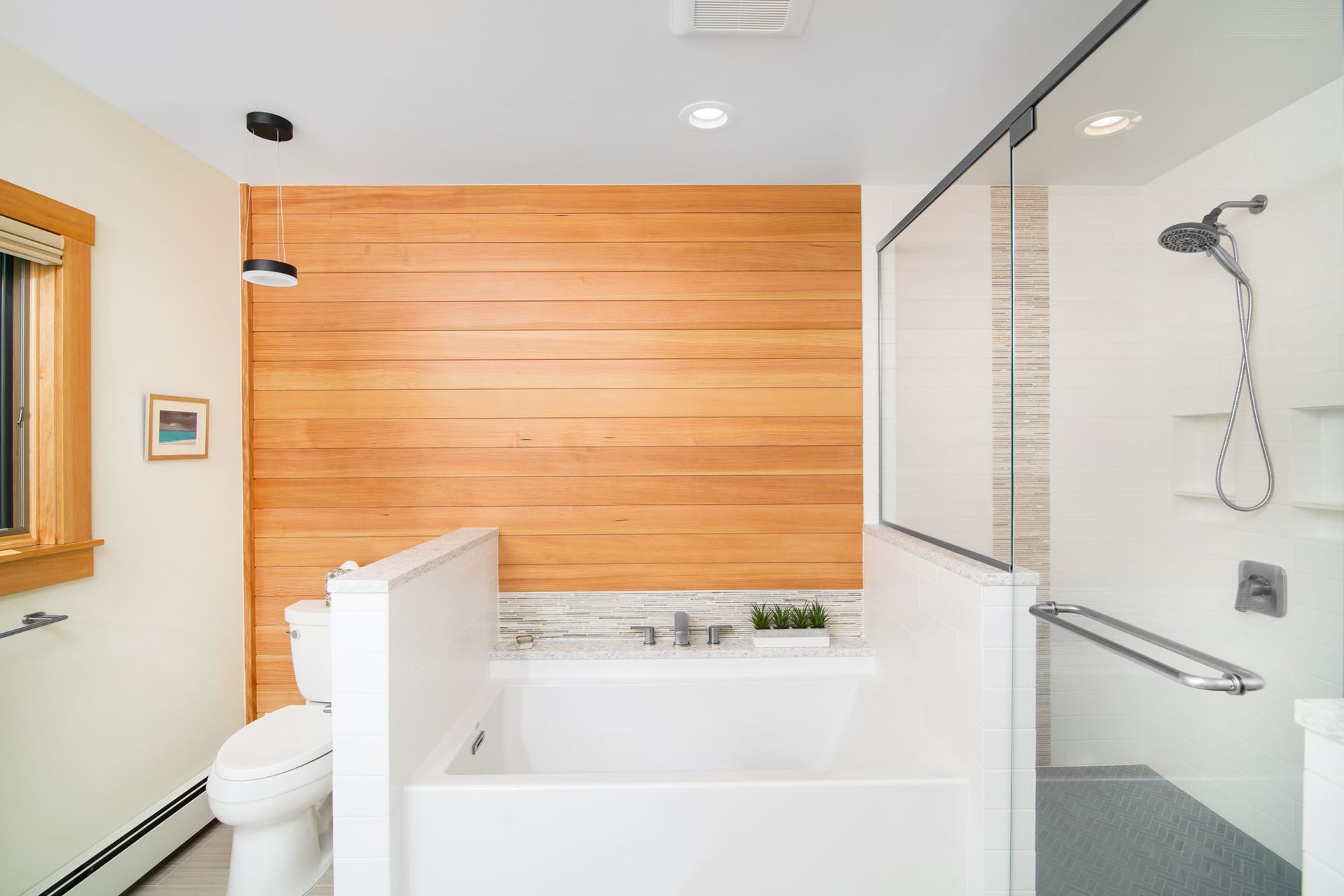 Studio Z designed an updated bathroom to provide the homeowners with a spacious shower and double vanity while still having plenty of space and natural light. The Douglas fir wall provides warmth as well as a pop of color to this relaxing primary bath.