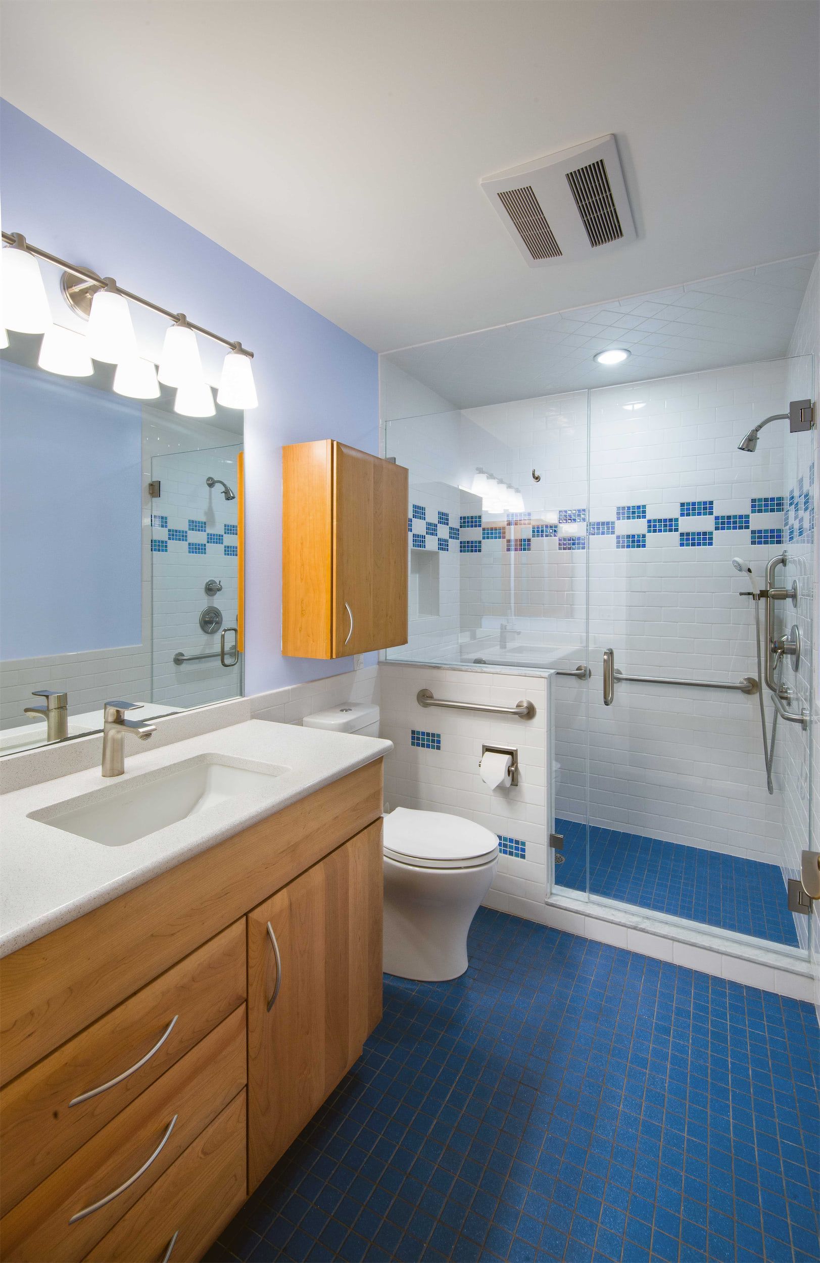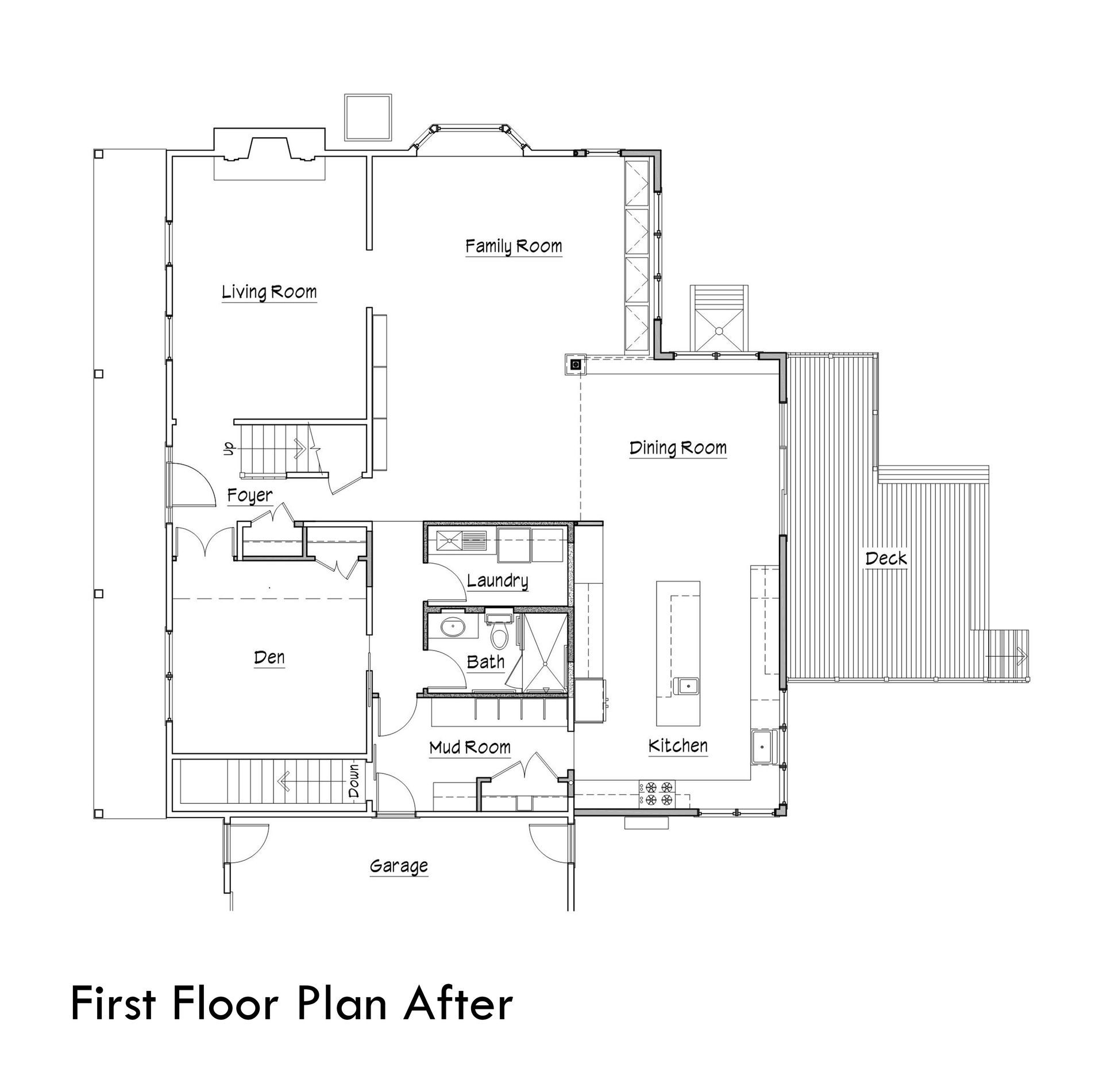 The existing dining room, powder room, pantry, and a short hallway were reconfigured to provide a den and two closets, one opening from the foyer and one from the den. This way the den could be used as a bedroom if needed due to illness. Although the goal was to provide a potential bedroom suite and bathroom for the owners’ parents if needed, the first floor bedroom and bathroom could be used by any family member or guest.