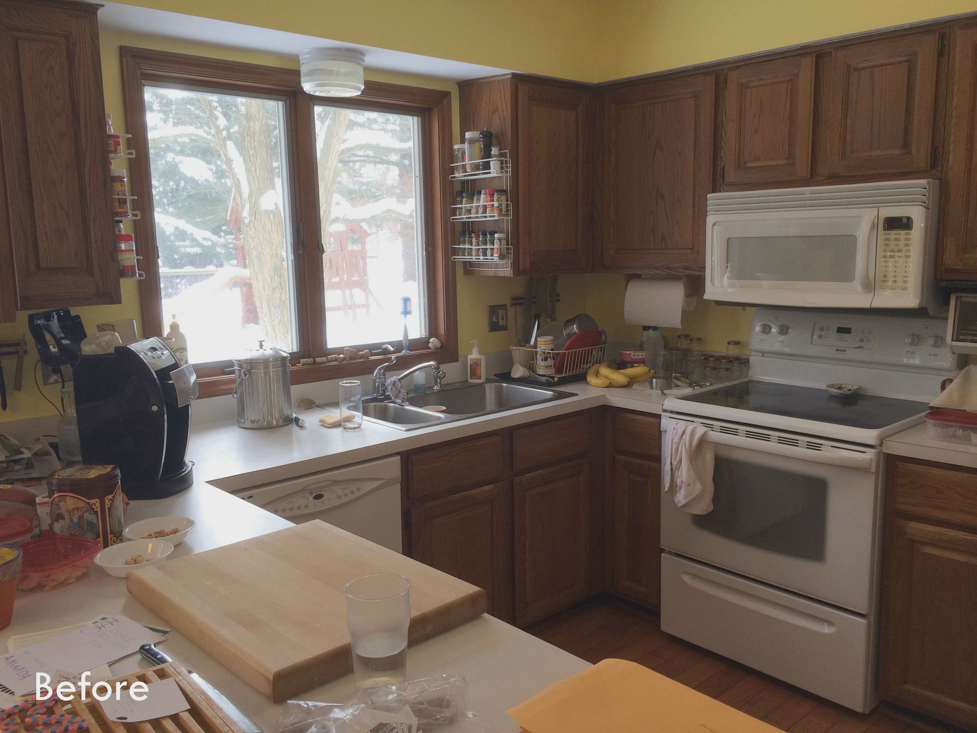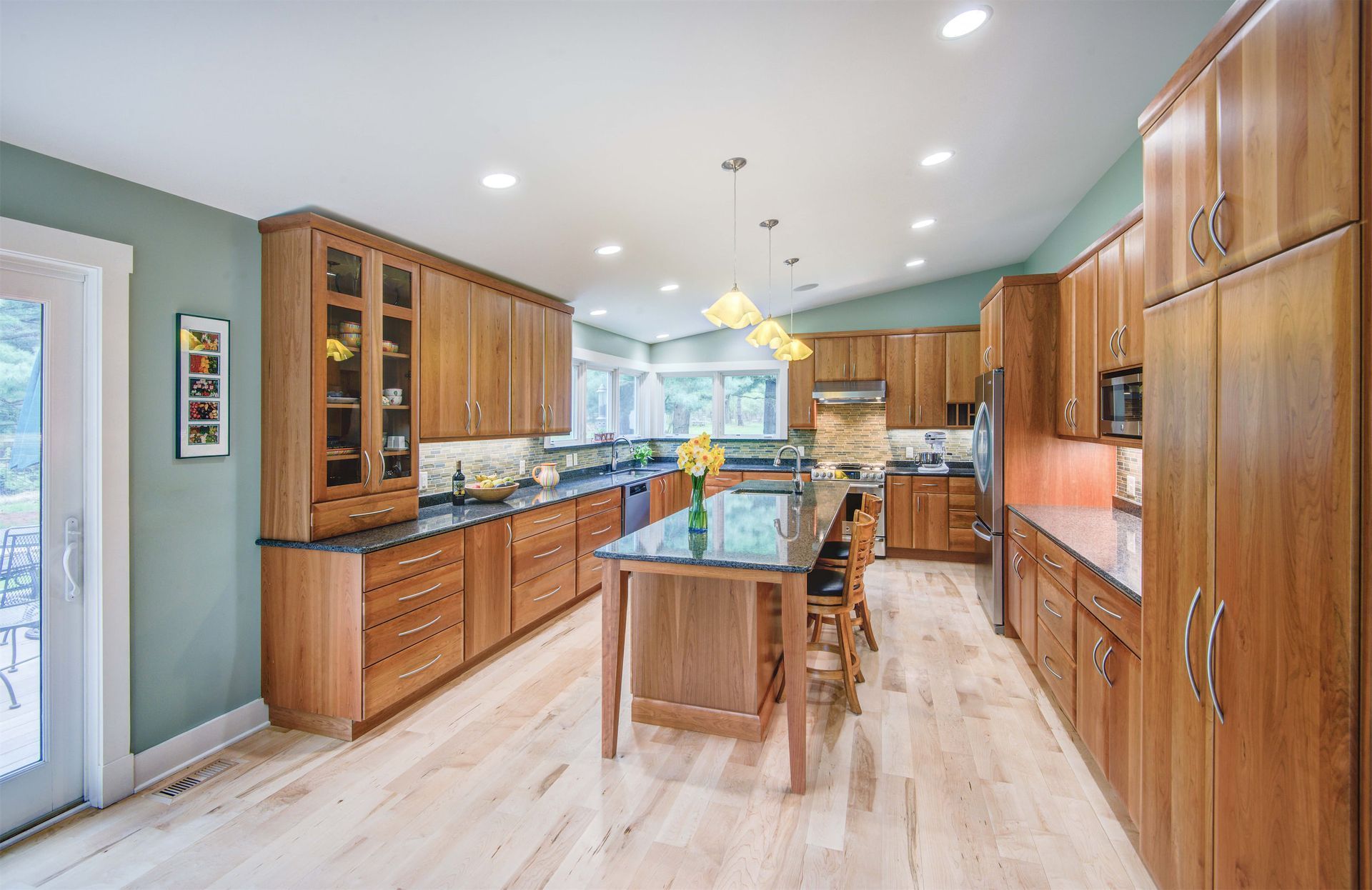 The owners of this 1980s Cape Cod had two young children and aging parents. Both owners love to cook and their 1980s-era kitchen lacked work space and storage. They wanted to expand their family room and design a first floor bedroom and bathroom that could be used by an aging parent if the need arose. They also wanted to improve the entry from the garage.