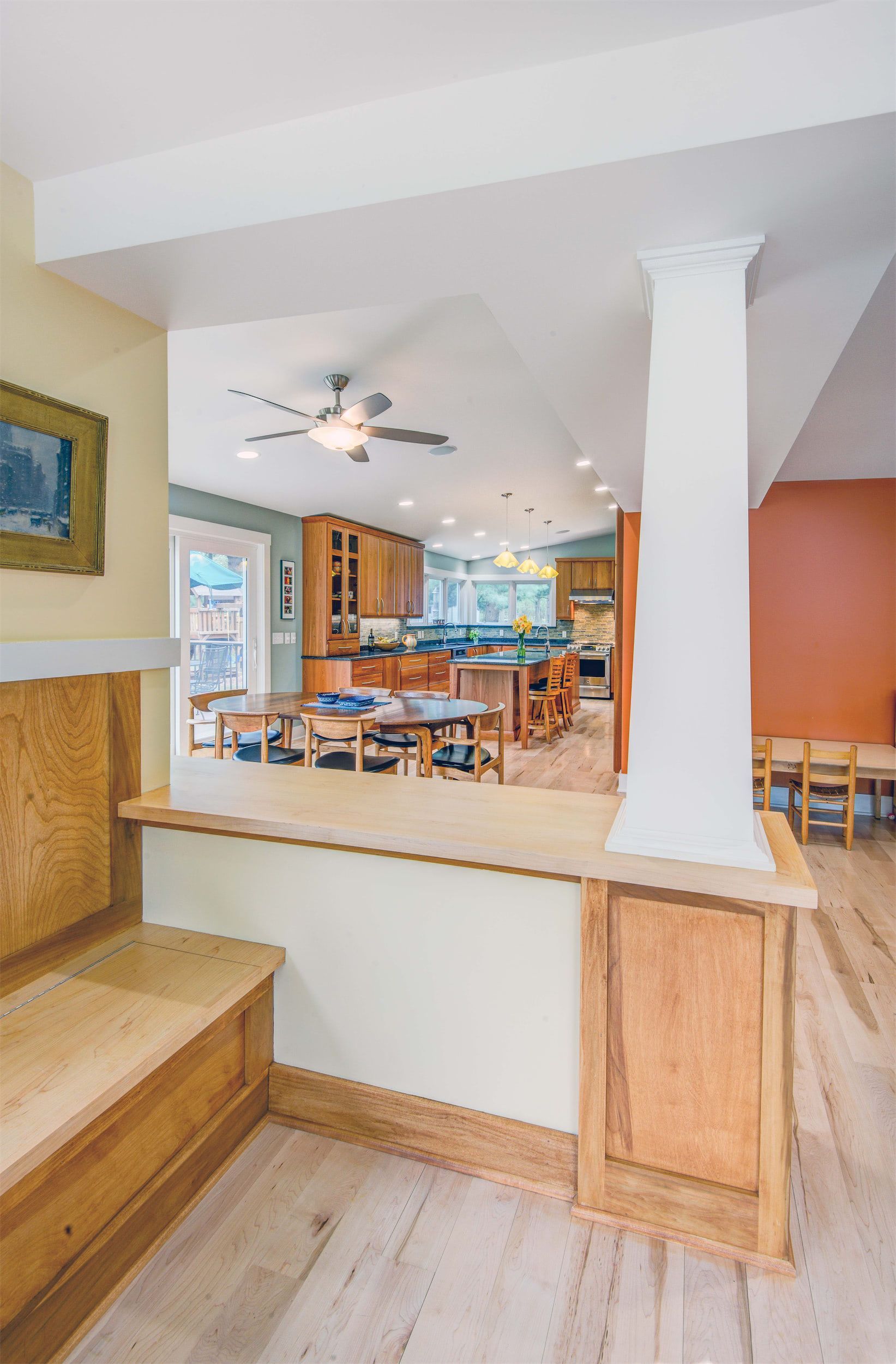 Studio Z designed an addition across the back of the entire first floor. Behind the family room, a 6-foot-deep addition provides additional floor space and a built-in bench under a wall of windows. Behind the existing kitchen and laundry room, a spacious new kitchen provides plenty of work space and storage for both cooks. The adjacent eating space is large enough for family gatherings.