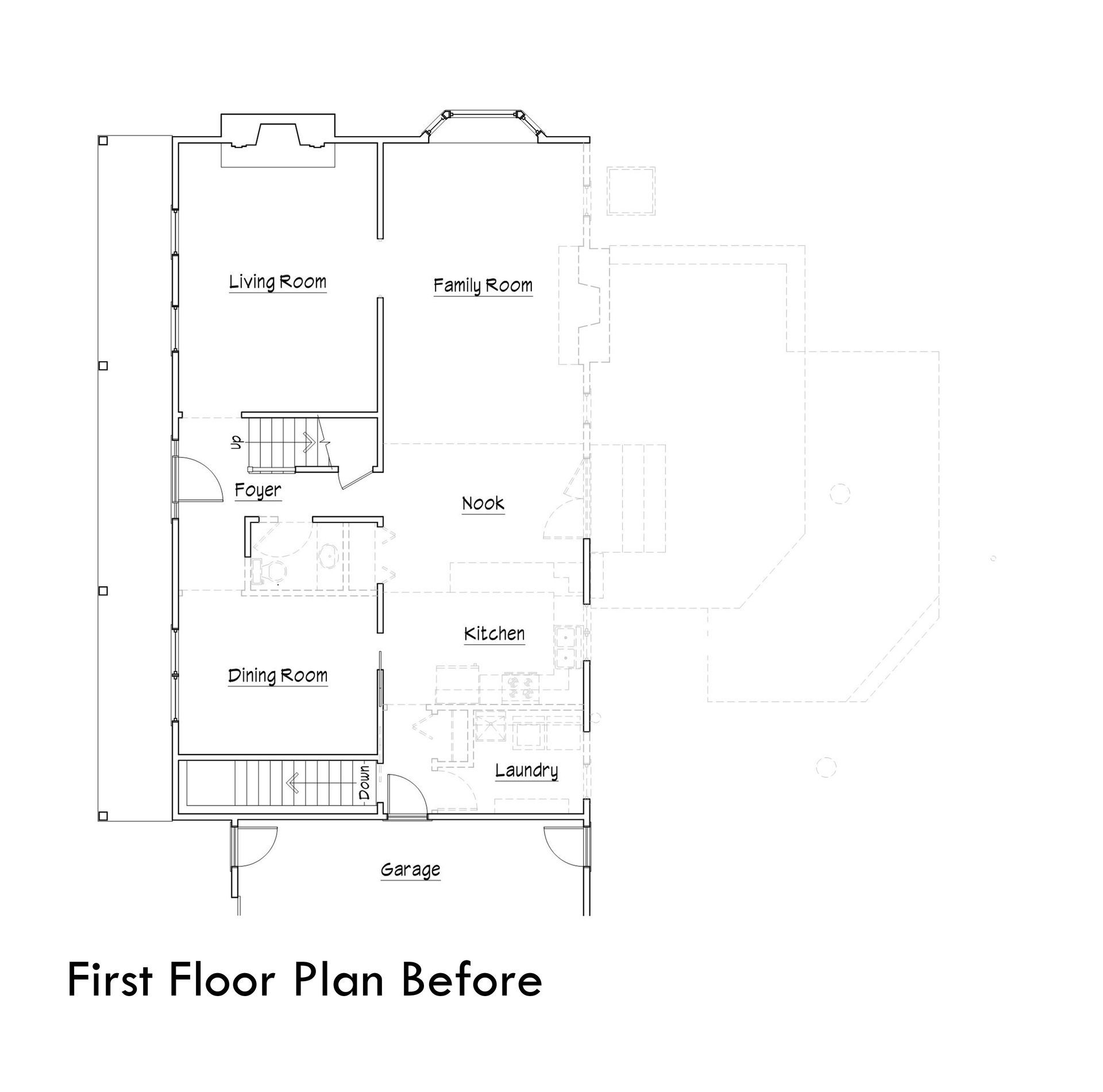 - Relocating the kitchen to an addition provides room for a laundry room and full bathroom.