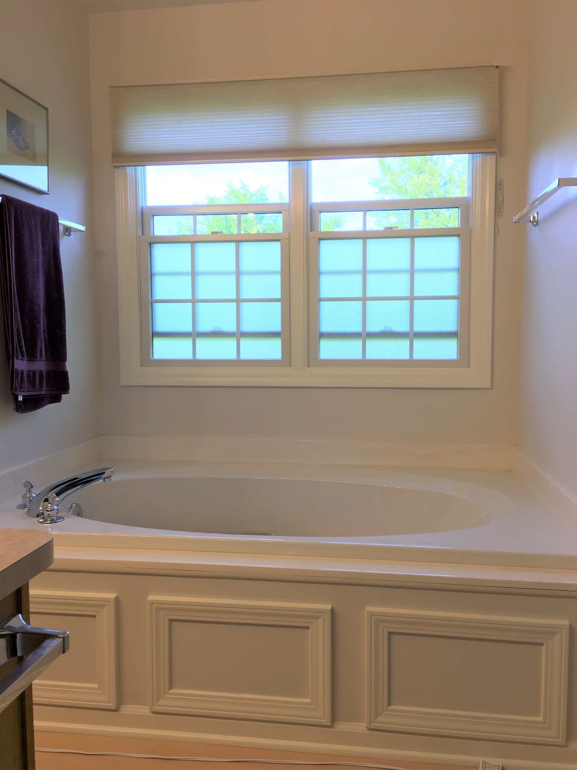 The Studio Z team came together to design a spa-like oasis. First, we removed the soaking tub to provide space for a sit-down makeup area and additional storage. The existing windows above the makeup area provide lots of daylight. They are supplemented by eight new LED wafer downlight fixtures and a new solar-powered operable skylight above the shower.