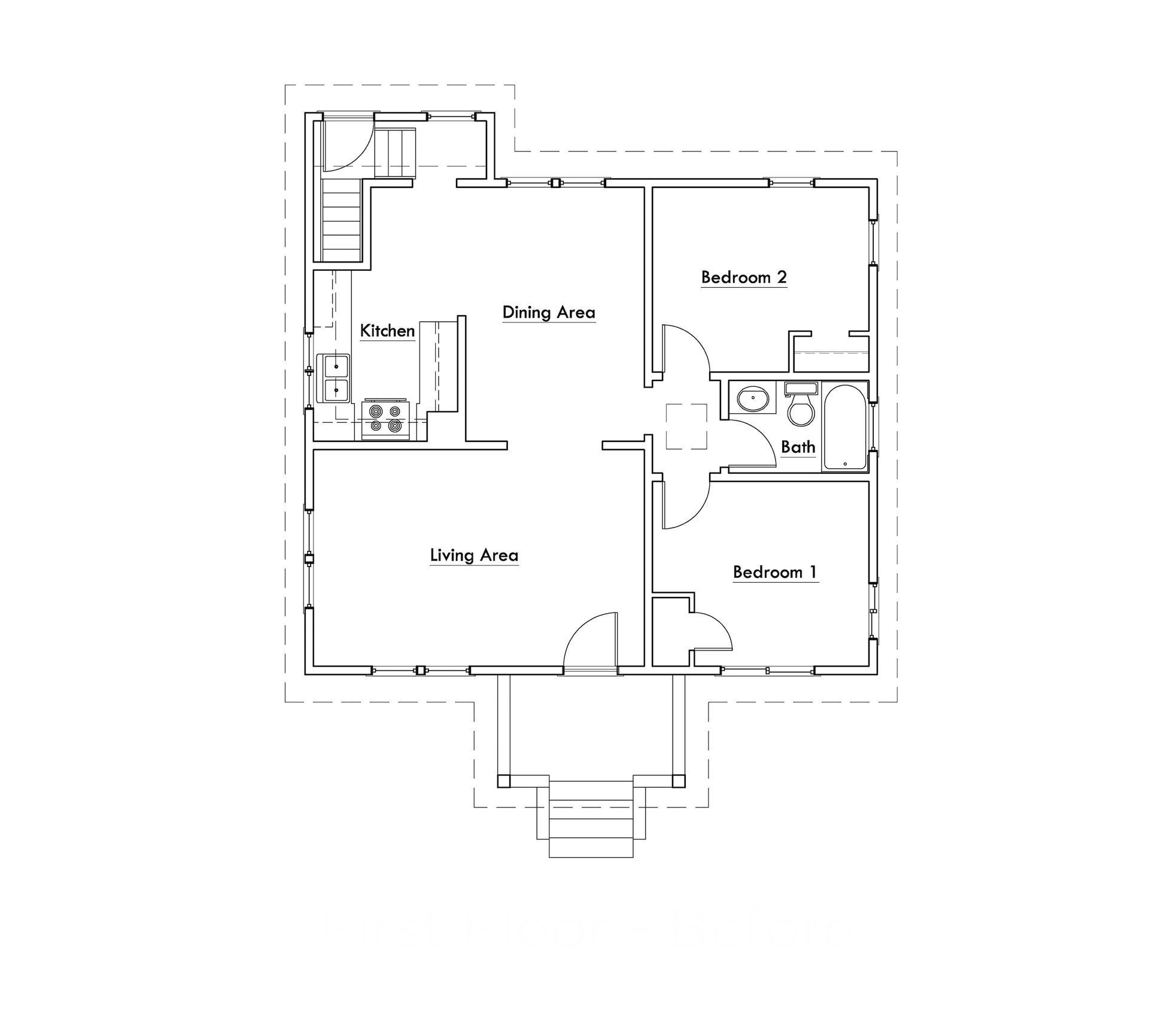 - Before: a 900-square-foot one-story house with two bedrooms, one bathroom, a living room, dining room, and tiny kitchen