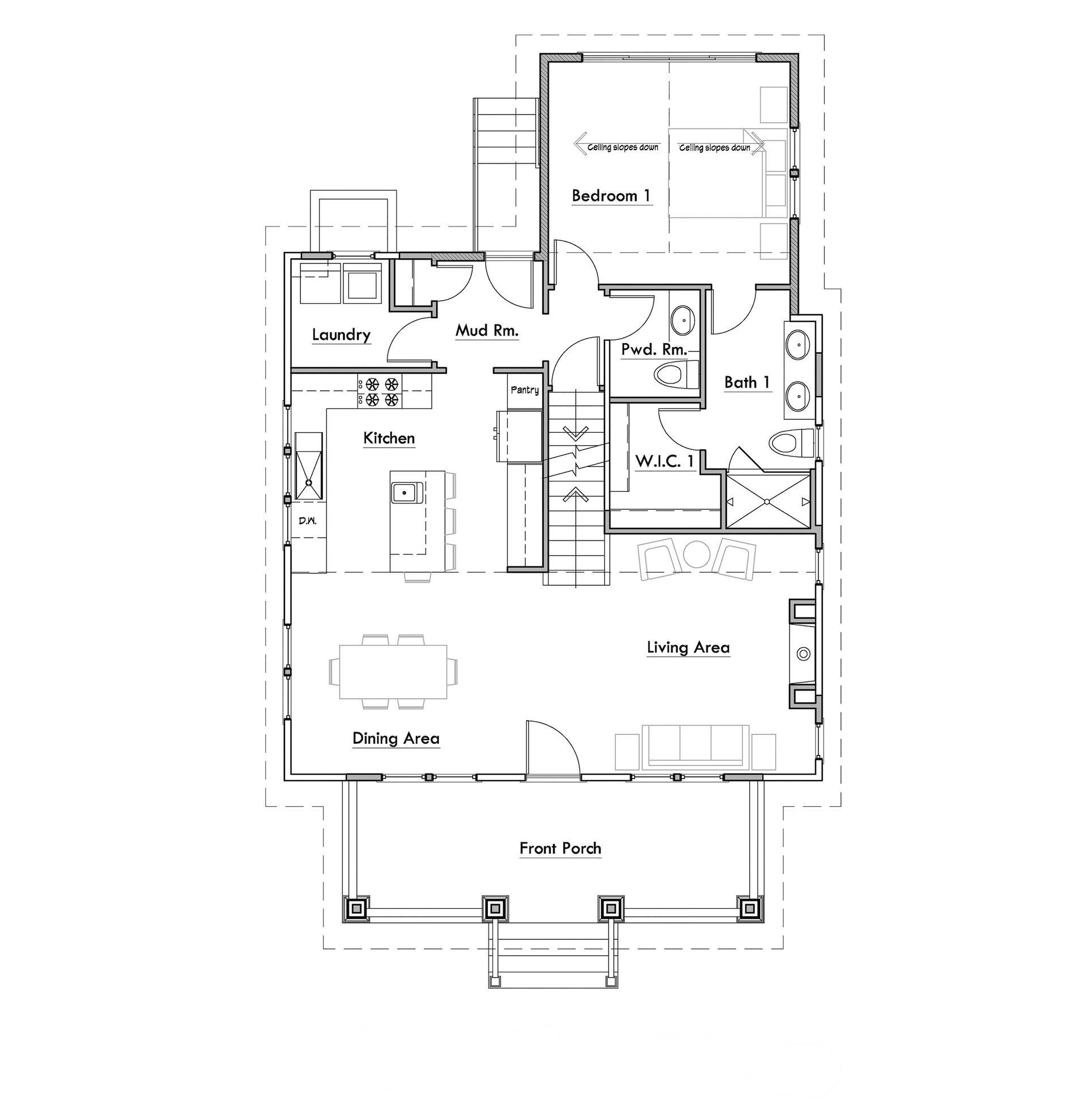Studio Z also moved the basement stairway to make way for the laundry room and back entrance; by stacking the stair to the second floor over the relocated basement stair, space taken by stairways was kept to a minimum, and both the first and second floor plans were made more efficient in the process.